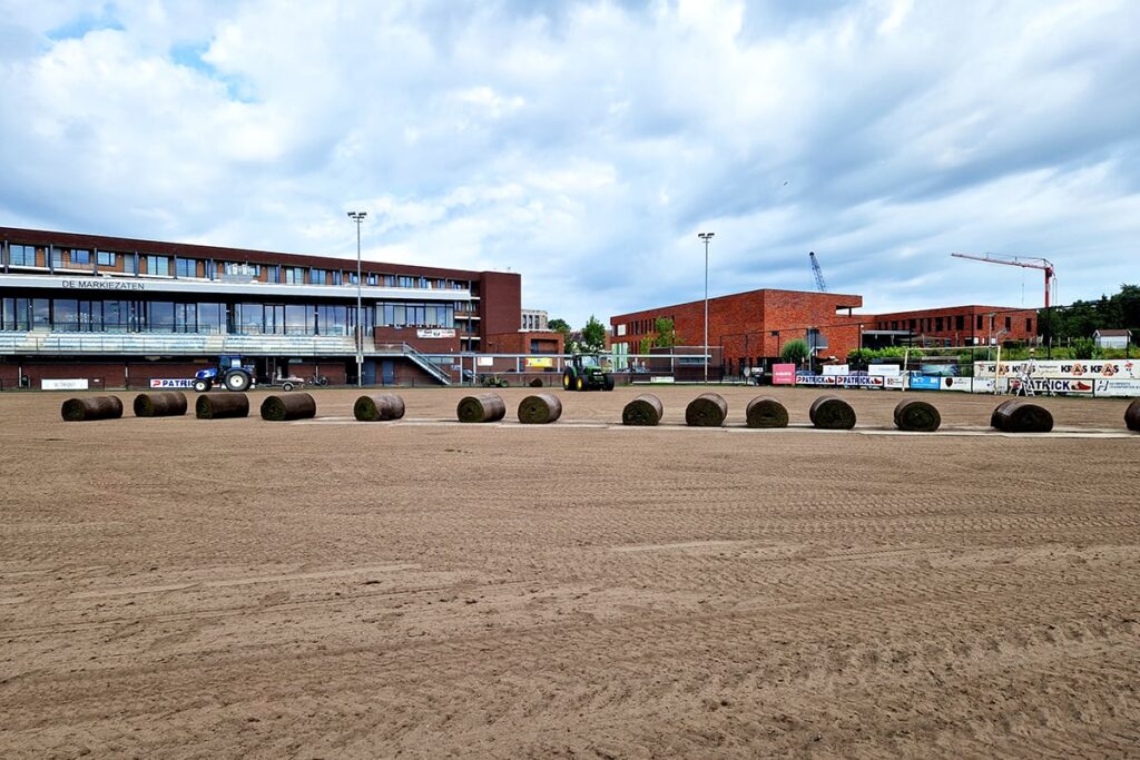 Nog een voordeel is de snelle realisatie van een Grass2play-mat. Voor het oefenterrein van Beerschot trok Krinkels amper vier weken uit. In die tijd werd er een bodemanalyse uitgevoerd, werden drainage en beregening gecontroleerd en vernieuwd, de bestaande en sterk vervilte grasmat afgefreesd, de toplaag met meer dan 1.000 ton gekalibreerd zand verschraald, de zoden geplaatst, het veld gerold en belucht en tot slot de doelen, belijning en cornervlaggen geplaatst. Meteen daarna was het veld speelklaar. “Vanaf nu ligt de focus op het onderhoud. Daarbij gaat het vooral om wiedeggen tegen viltvorming, regelmatig beluchten en doorzaaien met Engels raaigras. Een cruciaal aandachtspunt is het voorkomen van beschadiging aan het wortelgestel van de veldbeemd. Maaifrezen, verticuteren en snijbeluchten zijn daarom uit den boze. Het doorzaaien gebeurt door middel van inprikken. Omdat er doorgezaaid wordt met raaigras, dat sneller kiemt, verschuift na verloop van tijd het evenwicht in de grasmat en moeten de zoden na drie tot vijf jaar wel vernieuwd worden.”