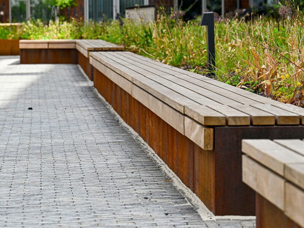 Met cortenstaal of gepoedercoat aluminium vervangt FURNS de traditionele manier van plantenbakken maken: met een gemetselde muur met een afdekrand. Van Duijnhoven: “Door simpelweg metalen prefab borderelementen te koppelen en stellen, creëer je snel een bloembak of groot plantvak. Naast de tijdwinst levert dit een aanzienlijke gewichtsbesparing op op daktuinen en kan het zelfs circulair ingezet worden.”