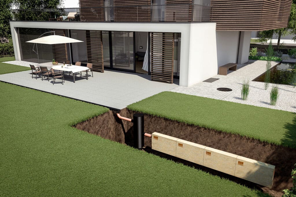 “In zo’n geval kan je opteren voor een systeem op basis van waterabsorberende rotswolblokken, zoals onze Infiltration Line. Deze 100% natuurlijke oplossing – rotswol is een natuurlijk product met een zeer lage milieu-impact – werkt als een spons: elk blok van 100x60x20 cm kan tot 112,8 liter water opnemen, om het vervolgens rustig weer aan de grond af te geven. Afhankelijk van de benodigde buffercapaciteit worden meerdere blokken eenvoudig achter elkaar geplaatst en door het compacte formaat volstaat het om een dunne sleuf te graven, bijvoorbeeld langs de rand van de tuin. Omdat wortels door de blokken heen kunnen groeien zonder de werking van het systeem te beïnvloeden, ben je bovendien vrij wat de plaatsing betreft. Dat maakt dit tot een heel laagdrempelige oplossing. Het enige waarop je moet letten – maar dat geldt bij elk infiltratiesysteem – is dat er zo min mogelijk vuil in terechtkomt. Een bladvanger of sifon ter hoogte van de afvoer is daarom een noodzakelijk accessoire.”