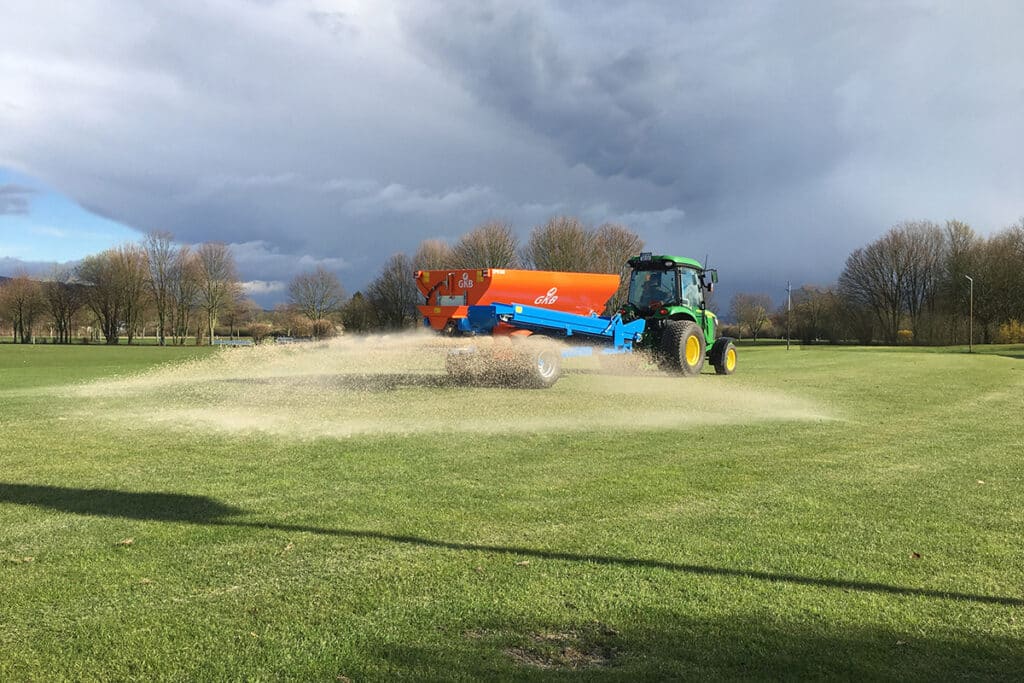 Een van de populairste GKB-machines is de Sandspreader: een bezandingsmachine waarmee je gelijkmatig zand over je sportveld of golfbaan strooit. Door zand te strooien, worden je grasvelden egaler. Je verbetert de bodemstructuur, zodat het water sneller draineert. Heel wat Amerikaanse bedrijven verkopen zandstrooiers, maar die mogen bij ons de weg niet op. GKB Machines is een van de weinige Europese producenten waarbij dat wel mogelijk is.