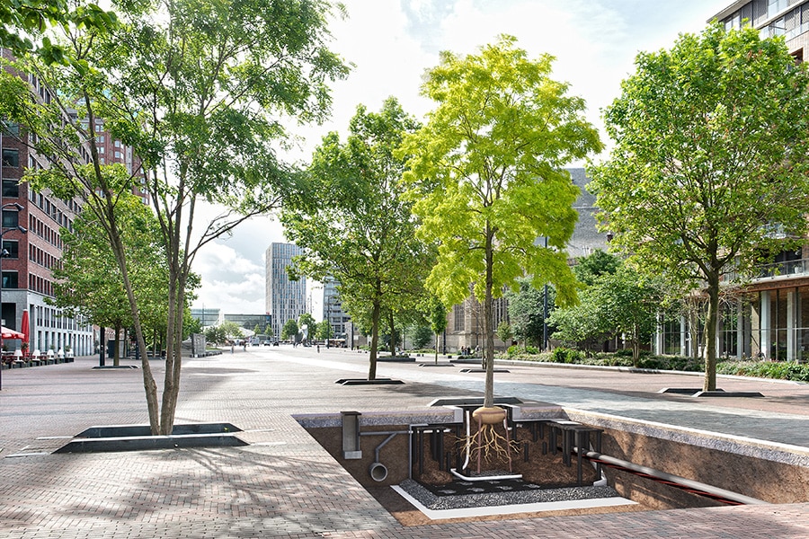 Het innovatieve TreeParker-systeem van TreeBuilders creëert de ideale groeiomstandigheden voor bomen in een stedelijke omgeving.
