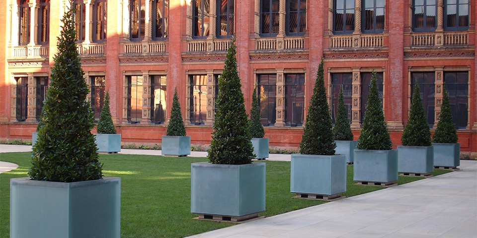 In het Londense Victoria & Albert Museum benadrukken laurierplanten in piramidevorm de statige architectuur.